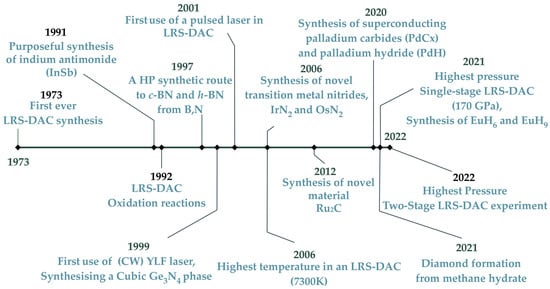 Accordingly, this article describes the physics underlying LRS-DAC experiments, outlines the chronological development of LRS-DAC systems/methods, and summarises key reactive synthesis experiments. Lists of materials created to date via LRS-DAC systems are provided, together with the precursors, process conditions, and laser source wavelengths/powers. It is our hope that this article provides a useful guide to further forthcoming LRS-DAC studies.