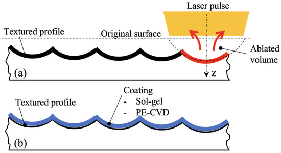 Schematic representation of proposed hybrid method: (a) Laser texturing; (b) subsequent coating treatment.