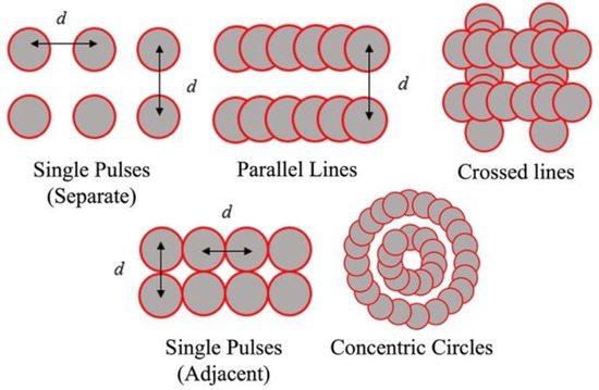 Five different scanning strategies were employed, including separate and adjacent single pulses, parallel lines, crossed lines, and concentric circles. For each scanning strategy, four tests were carried out over separate 8 mm × 8 mm areas while varying the average laser power from 2–17 W. Separate identical textured areas were prepared for samples to be coated with sol–gel and PE-CVD processes. All laser processing parameters employed during the study are shown in Table 1, while Figure 2 shows schematics of the different scanning strategies employed.
