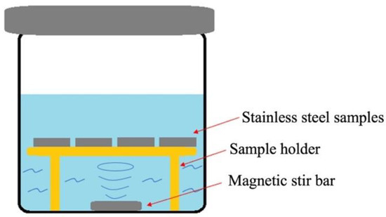 The sol–gel treatment was carried out in line with the existing literature [38]. For Surf 1, a closed beaker containing ethanol (C2H5OH), water (H2O), and ammonium hydroxide (NH4OH) with a molar ratio of 1/0.26/0.20, respectively, was stirred for 30 min at a temperature of 40 °C, after which TEOS was added to the solution until a concentration of 4.0 × 10−3 mol dm−3 was obtained. A support holding the laser-textured samples was then inserted, allowing the magnetic stirrer to rotate beneath the samples as shown schematically in Figure 3. The solution was stirred at a speed of 400 rpm and a temperature of 40 °C for 18 h. At the end of the operation, the samples were extracted from the solution, washed with ethanol, and placed in an oven at 100 °C for 22 h. This final operation was necessary to eliminate solvent and organic residues from the surface, densifying the film and thus improving its structural stability and mechanical properties.
