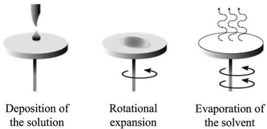 The same procedure was carried out for Surf 2 samples but using 3-aminopropyltriethoxysilane (APTES) as a precursor. Surf 3 samples were prepared with the same method as Surf 2 but with an intermediate spin-coated polymeric film on the laser-textured substrates. The necessity for such an interlayer was motivated by the requirement to improve adhesion between the sol–gel coating and the underlying metallic surface. The adhesion of silica nanoparticles to polymeric surfaces is well-documented in the literature [39,40]. The molecular chains on the surface of the PE are in fact a good foothold for the nucleation and growth of silica nanoparticles, improving adhesion of the coating to the underlying metallic substrate. Spin coating consisted of depositing 0.0284 g of polyethylene (PE) dissolved in 30 mL of dichloromethane on the surface, as shown in Figure 4, with the latter placed in rotation to spread the solution over the surface by centrifugal force, thinning the liquid through both the spreading and evaporation of the solvent. The successful deposition of thin PE films on laser-textured surfaces was verified via infrared spectroscopy, which highlighted the presence of characteristic peaks directly attributable to the typical polymeric structure of PE.