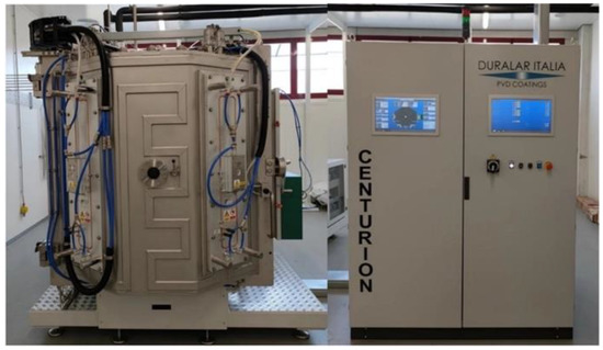 A second set of samples was coated using PE-CVD deposition, where specific gases were ionized and dissociated through plasma energy, reacting to form a thin film. The CVD technique has progressed enormously over recent years and is now considered one of the most reliable and effective ways of coating materials. It can be applied to a wide range of different materials, including plastics, metals, and ceramics, with negligible environmental impact and virtually no health risk. The main advantage of this technology is the possibility of obtaining a homogeneous and pure film on the substrate. PE-CVD deposition was carried out using a Duralar Centurion, shown in Figure 5. Samples were rotated in a planetary motion while a potential difference was created between the samples and the chamber to optimize treatment uniformity.