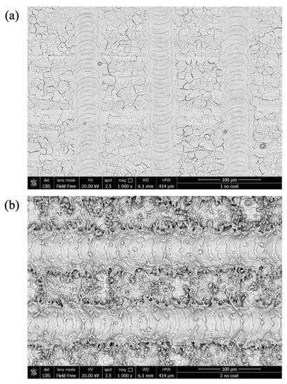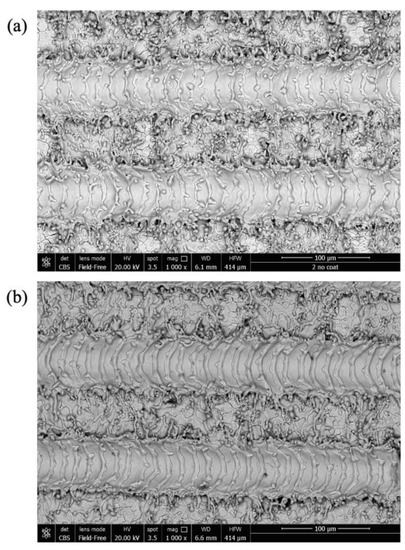 SEM images of laser-textured surfaces without coating obtained with parallel lines scanning strategy: (a) 2 W; (b) 7 W.