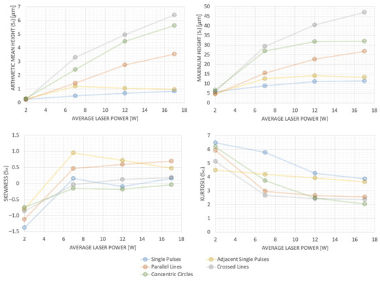 Figure 8 compares measured values of Sa, Sz, Ssk, and Sku for all the scanning strategies and laser powers. Increasing the laser power led to deeper craters and grooves, which is reflected in the measured values of both Sa and Sz. Separate and adjacent single pulses were nonetheless limited to maximum values of approximately Sa = 1 µm and Sz = 14 µm, while strategies employing a scanning speed of 300 mm/s achieved much higher surface roughness, up to Sa = 6.4 µm and Sz = 47 µm for the crossed lines strategy with an average laser power of 17 W. Ssk was between −1.5 and −0.5 for all strategies at 2 W owing to the presence of smaller, separate ablation craters or grooves. This led to a generally flat surface characterized by discrete, separate valleys. Ssk then increased with increasing laser power to approximately 0 for single pulses, crossed lines, and concentric circles, and 0.5–1 for adjacent single pulses and parallel lines. These outcomes imply that the height distribution was predominantly symmetrical, with slightly positive skewness in some cases due to distinct peaks resulting from the presence of remelt adjacent to craters and grooves, which can be seen in Figure 6. Sku was in the range 4.5–6.5 for all strategies at 2 W, implying a slightly leptokurtic height distribution characterized by sharp or indented portions. This parameter then steadily decreased with increasing laser power to 2–4 for all scanning strategies, implying that the height distribution was predominantly mesokurtic at high laser power.