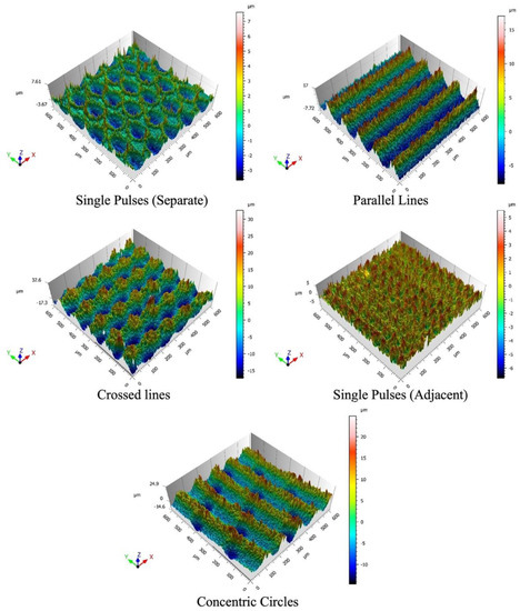 Figure 6 shows 3D topography maps of the five textures made by laser texturing at an average power of 17 W. Laser texturing created grooves and craters by laser ablation, where absorption of laser energy resulted in a rapid increase in surface temperature leading to the vaporization and ejection of molten material from the region exposed to the laser beam. Further to material removal, laser ablation in the nanosecond regime also led to melting and solidification of material around the edges of grooves, generating irregular bumps and ridges that increased the surface roughness. Strategies employing a laser scanning speed of 300 mm/s (parallel lines, crossed lines, and concentric circles) led to the creation of grooves in correspondence with regions exposed to the laser beam due to the relatively high pulse overlap, 75% of the focused laser spot diameter (60 µm). Strategies employing high scanning speed (separate and adjacent single pulses) instead led to the generation of individual ablation craters resulting from material ejection during each laser pulse with no overlap.
