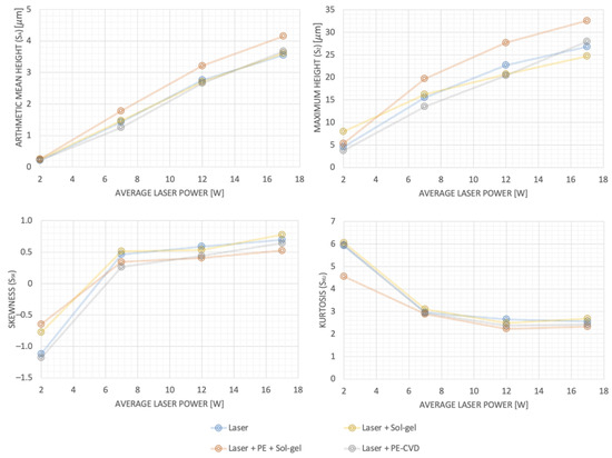 To confirm this outcome, Sa, Sz, Ssk, and Sku were quantified for Surf 1, Surf 3, and Surf 4, all subject to laser texturing with the parallel lines scanning strategy and different coating procedures (Figure 11). As power increased, so too did Sa and Sz in all cases, with more intense laser ablation leading to larger craters and ridges. Ssk increased from approximately −1 at 2 W to approximately 0.5 over the same range, while Sku decreased from 4.5–6 to approximately 2.5. Sol–gel coating led to an insignificant difference in roughness compared to surfaces subject to laser texturing alone; however, introduction of the PE interlayer led to an increase in Sa of approximately 0.5 µm and Sz of approximately 6 µm at the highest tested laser power. Minor differences in Ssk and Sku were also observed at low laser power; however, these were no longer significant at all other tested power levels. PE-CVD led to insignificant changes in surface roughness parameters compared to laser texturing alone. While introduction of the PE interlayer prior to sol–gel deposition clearly led to measurable effects on the resulting topography, differences in roughness parameters were nonetheless limited. Sol–gel and PE-CVD alone, on the other hand, led to accurate transfer of the underlying surface topography obtained by laser ablation. This outcome confirms that the approach allows surface topography to be tailored independently via laser ablation, with subsequent sol–gel or PE-CVD coatings having negligible effect on the resulting arithmetic mean surface roughness.