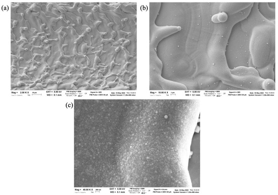 SEM images at (a) 2000×, (b) 10,000×, and (c) 40,000× of surfaces obtained with parallel lines scanning strategy at 12 W: Surf 3 sample (laser texturing + sol–gel (APTES + PE interlayer)).