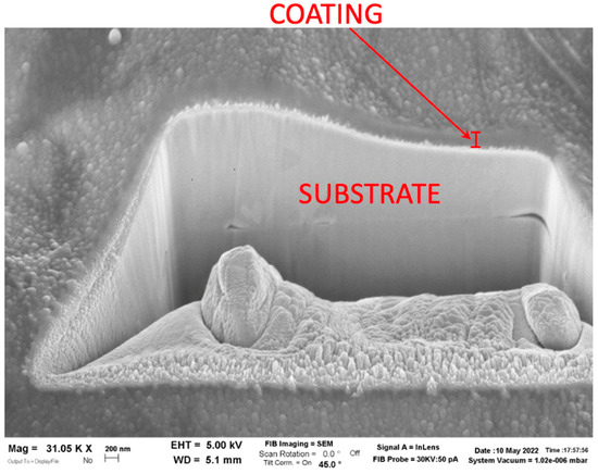 SEM image of cross-section obtained by FIB machining of surface textured with parallel lines scanning strategy at 12 W: Surf 3 sample (laser texturing + sol–gel (APTES + PE interlayer)).