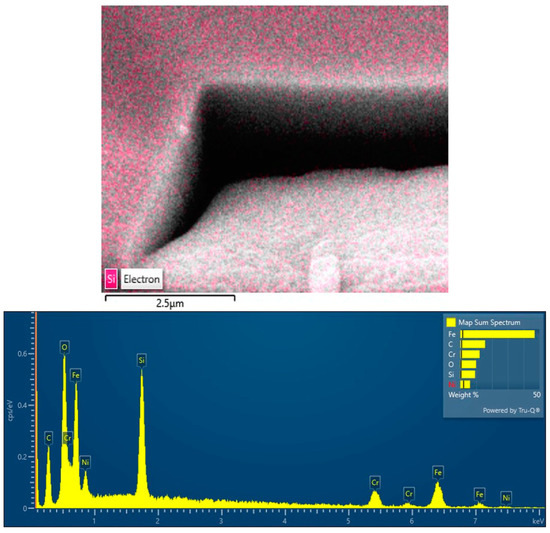 The results of SEM-EDX analyses performed on the same surfaces are shown in Figure 17 and Figure 18. EDX spectra confirmed the presence of iron (Fe), chromium (Cr), and nickel (Ni), which can be attributed to the metallic substrate exposed during FIB machining, as well as silicon (Si), which can be attributed to the applied coatings. Comparing the spectra for Surf 3 and Surf 4, the presence of Si is much higher in the latter case, suggesting that PE-CVD exhibited a more pronounced effect on the surface chemical composition than the sol–gel treatment with a PE interlayer. Further investigation into this aspect is now required. The color maps of Si provide a qualitative representation of the distribution of this element on the sample surface. A distribution of particles containing silicon can be observed on the portion of the surface under examination, while the underlying substrate exhibits much lower quantities. The presence of Si below the coatings can be attributed to residual Si within the material itself (<1% for AISI 304), as well as the deposition of ablated material during FIB machining. The outcomes of SEM-EDX analysis nonetheless confirm the effective modification of surface chemistry for both sol–gel and PE-CVD treatments, in line with the presence of silica nanoparticles.