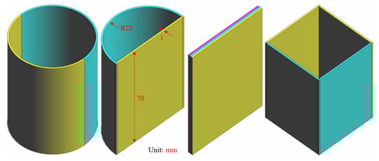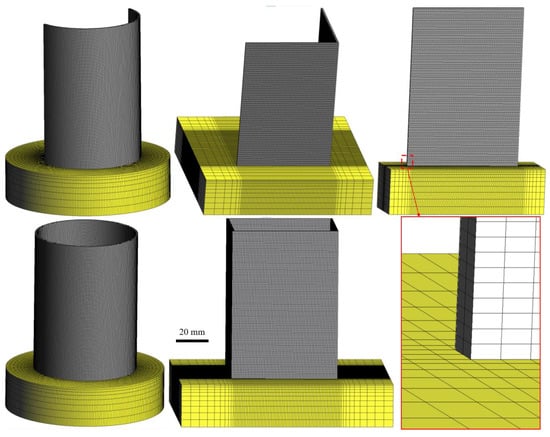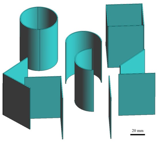 Figure 3 shows the FE meshes of five different thin-walled structures characterized by the same wall thickness of 1.0 mm. The numbers of hexahedral elements and nodes used for these geometries are listed in Table 2.