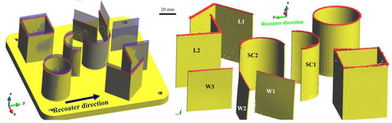 The difference in the manufacturing process between these two thin-walled structures is due to their orientations with respect to the recoating movement. In particular, sample L2 has one of the two walls parallel to the movement of the recoater (see Figure 4). Thus, its structural stiffness to the recoater loading is higher than the one of sample L1. This can be easily appreciated when comparing the warpages of L1 and L2 and keeping in mind that the recoater loading is in the Y-direction.