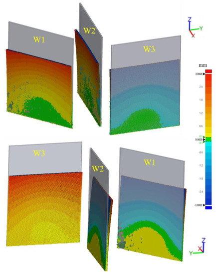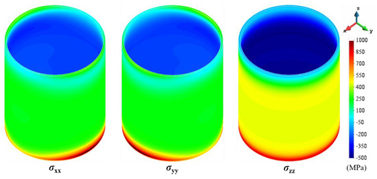 Figure 13 compares the simulated displacement distributions and the experimental 3D-scan measurements for the cylindrical part. Figure 14 shows the corresponding residual stress field. Note that compressive stresses are produced on the inner surface of the cylinder while its external surface suffers tensile stresses. Thus, the cylinder contracts in the radial direction during the cooling process, and relatively small radial displacements are generated due to the higher structural stiffness of closed geometries compared to the open ones [53,54]. However, also in this case, a large Y-displacement, up to 0.5 mm, can be appreciated (Figure 13). Moreover, the build is uncompleted due to the collision between the scraper and the distorted part.