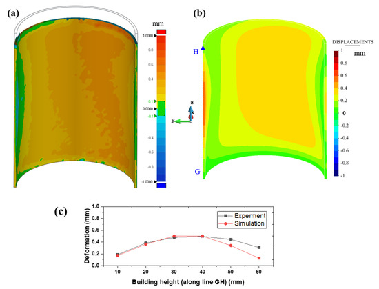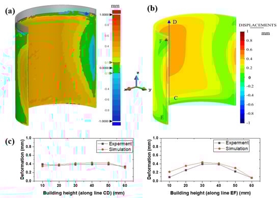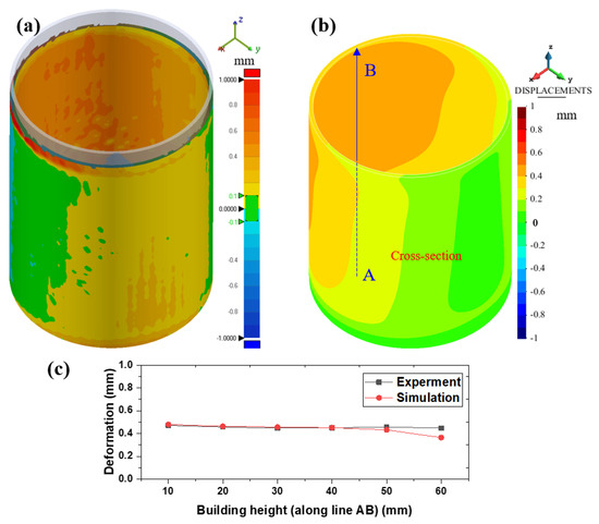 Comparison between the (a) experimental and (b) simulated displacement distributions of the hollow cylindrical part. (c) The deformation distribution along the line AB located at the center of the inner surfaces of the build.
