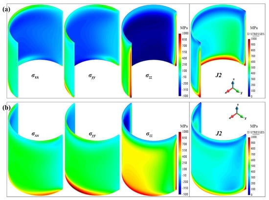 Residual stresses in three orthogonal directions and von Mises stress fields: (a) semi-cylindrical (SC1) part; (b) semi−cylindrical (SC2) part.