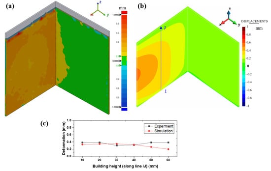 L−shape (L2) part: comparison between the (a) experimental and (b) simulated displacement distributions. (c) The deformation distribution along the line IJ located at the center of the inner surfaces of the build.