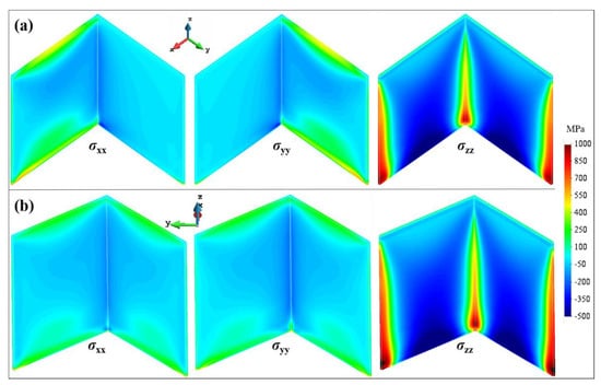 Residual stresses in three orthogonal directions: (a) L1 case; (b) L2 case.