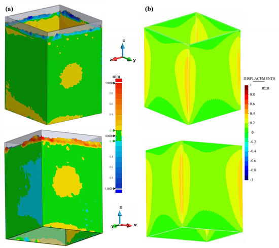 Comparison between the (a) experimental and (b) simulated displacement distributions of the hollow square part.