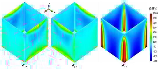 Similar considerations apply for the hollow square part in terms of both warpage (see Figure 15) and stress distributions (see Figure 16). The higher stiffness of this geometry compared to the single-wall or the L-shape structures implies a smaller distortion of the build. However, in Figure 15a, the same bulging phenomenon can be appreciated, being more pronounced in the surfaces orthogonal to the recoating direction.