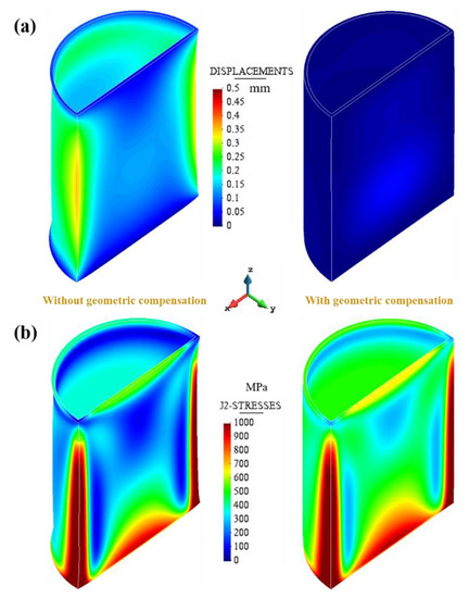 One integrated component from Figure 17 without and with geometric compensation: (a) distortions; (b) residual stresses.