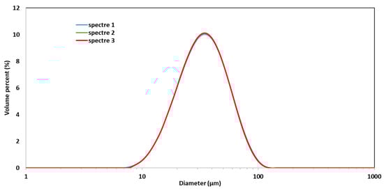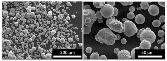 For this study, EOS 316L powder is used. At the beginning of the project, the dispenser is filled with a batch of fresh powder. The powder is then recycled from one print to the other without adding fresh powder. Between each print, the used powder is sieved with an 80 μm sieve and mixed with the remaining powder in the dispenser. Figure 1 shows images of the powder taken with a scanning electron microscope (SEM) (SNE 4500M, SEC Co., Ltd., Suwon, Republic of Korea). The size of most of the powder grain size is between 30 μm and 40 μm, as shown, and some particles are merged. A Mastersizer 3000 (Malvern Panalytical, Malvern, UK) particle size analyzer is used to determine the particle size distribution of the powder. Three measurements are taken and the d-values D10, D50, and D90 of the particle size distribution are, respectively, 18.5 μm, 35.6 μm, and 65.3 μm (see Figure 2), where D10, D50, and D90 give the maximal particle size diameter that includes 10%, 50%, and 90% of the particles (volume weighted basis), respectively.