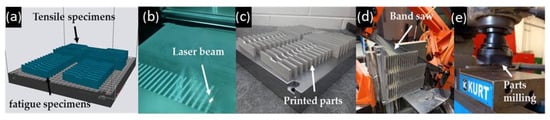 Additive manufacturing specimen preparation, (a) STL file preparation with EOSPRINT, (b) parts building, (c) finished print, (d) parts cutting, (e) supported surface machining.