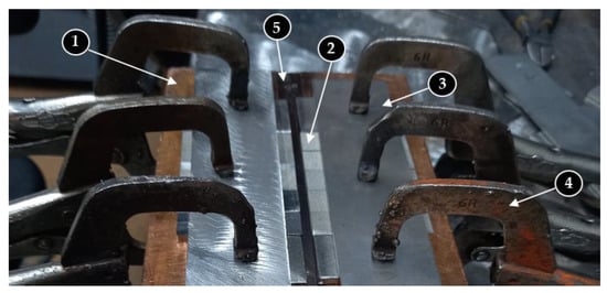 Welding jig: (1) Copper plate, (2) specimens welding side, (3) clamping part, (4) clamps, (5) groove.