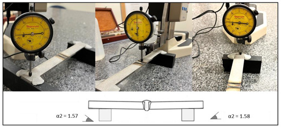 Since welding is performed from one side, and as a result of the heat imposed during welding, an angular deformation is expected. Since the top side receives more heat, it becomes concave and the back side becomes convex. Sung-Wook Kang [29] studied the effects of angular distortion on stress concentration and fatigue life. It has been demonstrated that fatigue cracks appear on the welding side (the surface where the welding is applied). In order to quantify the impact of this phenomenon on mechanical tests, angular distortion is measured using a dial indicator.