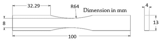According to the ASTM E8/E8M, tensile testing is performed via milling on standard rectangular samples. This choice ensures ease of printing and material support removal. Specimen dimensions in mm post-treatment are shown in Figure 7. To assess the repeatability of the test, four tensile specimens are prepared for each configuration. The tensile tests are performed on an MTS 809 tensile testing machine; the test speed is set to 0.025 mm/s and the pressure applied by the clamping dies is equal to 2000 MPa in order to avoid any slippage.