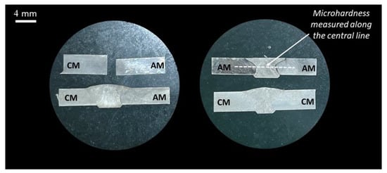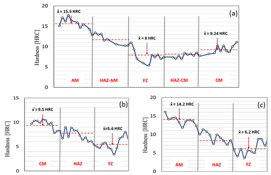 Based on the microhardness measurements along the cross-section welded specimens shown in Figure 12, it is remarkable that welding decreases the microhardness values as it approaches the welded joint. Figure 12b,c show just half of the measurements because the welding is homogeneous, and the two half curves are similar. By looking at the average hardness value, the microhardness decrease is more significant for AM welded parts than for CM welded specimens: 56% (14 HRC to 6.2 HRC) compared to 40% (9.5 HRC to 5.6 HRC), (Figure 12b,c). For the AM-CM configuration, the tested specimen shows a smaller microhardness in the fusion zone than those of the two base materials. There is a difference of 7.5 HRC for the AM side compared to 1.1 HRC for the CM side. These microhardness variations are consistent with the results found in the literature [14,30].