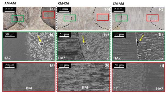 For welded configurations, cross-sections are observed with SEM. Figure 11 presents the results of these observations. The three metallurgical zones listed below are visible (Figure 11a–c). By observing the images of the two base materials (Figure 11g,h), we can see that both conventional and AM materials contain partial porosity. CM material exhibits a typical cold-rolled microstructure, where the direction of the rolling can be clearly seen (Figure 11h). It is also visible that the fusion zone is similar on both the AM and CM sides (Figure 11f,h,i). The latter contains some pores (Figure 11d,e). Some anomalies of material discontinuity are detected at the transition from the fused zone to the HAZ of the conventional side in the case of heterogonous welding (Figure 11f). The width of HAZ varies between 2 and 3 mm for all the configurations. The surface of the AM base material (Figure 11h) presents a typical micrography of the parts resulting from the L-PBF process (layer by layer). Similar images were presented in the study of Laitinen et al. [20] and in the technical data sheet of the EOS powder.