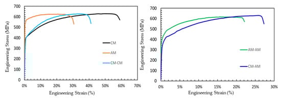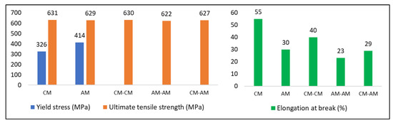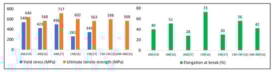 Table 8 and Figure 15 show comparable values from the powder supplier EOS and from Mokhtari et al. [14]. For non-welded AM specimens, the results found in this study are lower than those mentioned in the EOS specifications, although the difference is very low (2%) for the ultimate stress. For convention material, except for the elongation at break, which is lower in our study, the results are comparable with Mower et al.’s study [28].