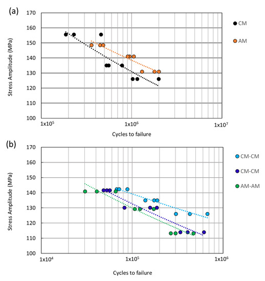 Fatigue finite life range: (a) Non-welded specimens (CM, AM), (b) welded parts (CM-CM, CM-AM, AM-AM).