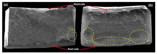 When compared visually with other observed fracture surfaces, this specimen has more pores (see Figure 18a,b). It is also remarkable that for all observed fracture surfaces, the surface anomalies are always in the lower part (root surface) of the specimen during welding (Figure 18a,b). This observation could explain the density of the melt decreasing proportionally to the specimen depth.