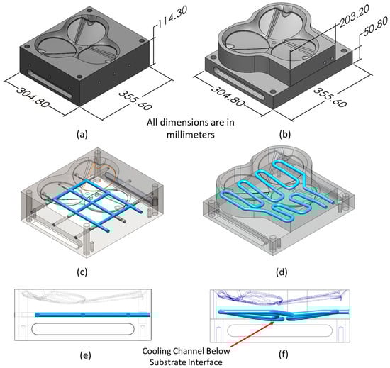 Mold design (upper half of mold not shown): (a) isometric view of traditional (machined) mold with overall dimensions; (b) isometric view of optimized (printed) mold with overall dimensions; (c) isometric view of traditional cooling channels; (d) isometric view of conformal cooling channels; (e) side view of traditional cooling channels; and (f) side view of conformal cooling channels.