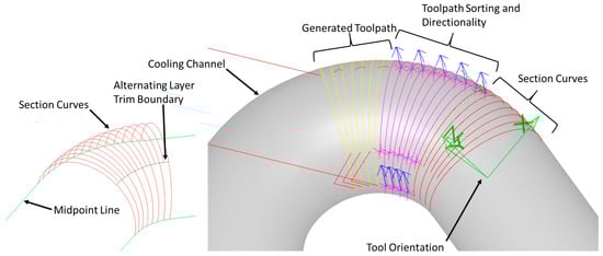 The cooling channel sections for the tool were classified as either linear or curved. For each classification, a different CAM strategy was employed. For the linear cooling channels, as shown in Figure 2, a planar slicing method was used (refer to the Video S2). All additive passes were equidistant and followed an isoparametric slicing strategy to the respective cooling channel. For alternate layers, the direction of motion was reversed to help reduce the non-uniform buildup due to the start and stop of the deposition tool path.