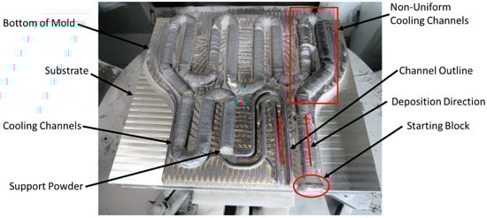 Unlike LPBF, blown-powder directed energy deposition (DED) allows for the manufacturing of functionally graded material, which could enable multi-material molds with customizable thermal conductivities in select locations. By incorporating highly conductive materials such as copper, the mold performance can be increased as much as 70% [,]. Recent studies by Kapil et al. and Pragana et al. have shown that conformal cooling channels can be produced with wire-arc DED [,]. Furthermore, DED enables the manufacturing of complex shapes that are impossible using traditional manufacturing techniques, such as machining, and at a size scale not seen with other additive manufacturing techniques, such as LPBF. However, there is little to no work on the manufacturing of conformal cooling channels with blown-powder DED.