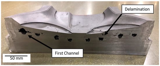 To further understand the delamination morphology and resulting geometry, the mold was cross-sectioned using a bandsaw. As shown in Figure 7, most of the lack of fusion defects were between the top surface of the cooling channel and the subsequent deposition. By reducing the laser power to mitigate concerns of overheating the cooling channels to the point of structural failure, the authors introduced more defects than originally anticipated. As shown in Figure 7, while the first deposited channel on the left side was the largest and most circular, there was significant delamination on the sides. This was due to excessive powder being trapped on the print surface. As previously discussed, this was later mitigated by depositing the channel outline (refer to Figure 6). The internals of these channels were also cleaned of excess powder before it was determined that the excess powder in the channels was needed to support the molten metal during deposition. Once that was determined, the powder was manually placed back into the cooling channel cavity. Once these two modifications were made to the deposition process, as shown in the figure, the cooling channels had fewer defects and the overall shape and size became more uniform (refer to Figure 6).