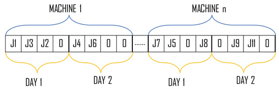 As the objective is to determine the optimal sequence of operations to be performed on various machines, it is imperative that the chromosome accurately represents this information. With this in mind, the chromosome was designed to represent the sequence of operations scheduled on each machine. It is worth noting that the allocation of jobs to machines and the sequencing of those jobs on each machine are two important aspects of the scheduling problem. These aspects are captured in the chromosome through its positional encoding, where the position of each gene represents the machine to which the job has been assigned, and the sequencing of the job on that machine. The chromosome was designed with a fixed length, which is determined by the number of machines, the number of jobs, and the number of scheduling days considered in the problem. In the example shown in Figure 4, the chromosome was designed to allocate a maximum of four different jobs per day on the machines, and considers a total of two scheduling days. As such, the first four allocations of the chromosome represent the jobs assigned to the first machine on the first day, the next four represent the jobs assigned to the first machine on the second day, and so on. It is also worth mentioning that, once the chromosome is defined, its dimensionality cannot be changed during the execution of the algorithm. To account for this, the presence of zeros was taken into consideration in the chromosome design, allowing solutions to be identified even if not all possible allocation slots are occupied. In this context, the zeros are simply skipped, as shown in the example in Figure 4.