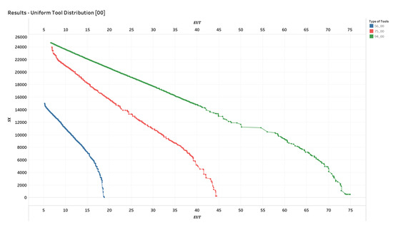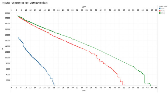 In this section, we present the most relevant results obtained from our experiment. The results are shown through scatter plots, with the x-axis representing the value of the objective function and the y-axis representing the value of the objective function . As a reminder, the goal of the proposed genetic algorithm is to minimize the weighted sum of these two objective functions, obtaining a Pareto front of optimal solutions that allow the decision-maker to choose from among them the appropriate solution depending on the situation at hand. The results will be presented in two steps: first, the results obtained by keeping the distribution of the tool type constant while allowing the number of tools to vary; second, the results obtained by keeping the number of tools constant while observing what happens when the distribution of the tool type varies.