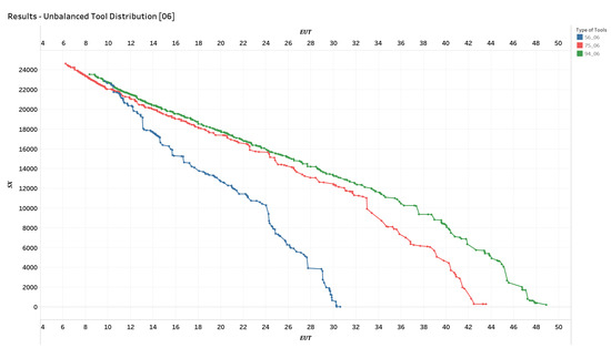Domain Solution—Unbalanced Tool Distribution [06]. Blue, red, and green colors represent solutions corresponding to scenarios with 56, 75, and 96 tools, respectively.