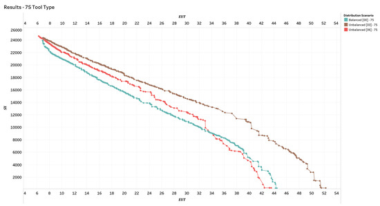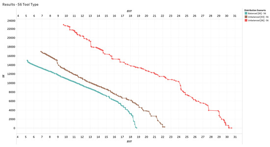 Finally, we focus on the results obtained when the number of tool types is fixed and the distribution of tool types varies. Figure 12, Figure 13 and Figure 14 depict, respectively, the three distinct scenarios: Figure 12 depicts a scenario in which the number of tool types is at its lowest value (56), Figure 13 depicts a scenario in which the number of tool types is 75, and Figure 14 depicts a scenario in which the number tool types is 94. In these figures, the colors light teal, brown, and red represent different classes of solutions corresponding to scenarios with Uniform [00], Unbalanced [03], and Unbalanced [06] distribution, respectively. The results show that, with a fixed number of possible tools to be used, as the distribution of the tools between the technological cycles changes, better results are obtained in scenarios with a large number of tools and a uniform distribution between the machines (i.e., solutions with decentralized tool warehouse). This consideration becomes less important as the number of different tools increases and reverses in scenarios involving 94 distinct types of tools. On a practical level, we can conclude that if a small number of tools are predominantly used in the technological cycles, it is advantageous to use an onboardmachine warehouse, while a centralized warehouse is more advantageous in the case where the number of tools is large.