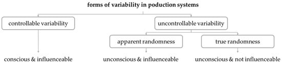 Controllable variability is defined by a stable and consistent pattern of variation over time [4]. In terms of events, controllable variability is the result of conscious decisions [1] (p. 265). Their causes are deterministic. Uncontrollable variability is characterized by a pattern of variation that changes over time and can therefore be unpredictable [4]. Stochastic events that cause uncontrollable variability are consequently beyond the control range [1] (p. 265). According to Hopp and Spearman, uncontrollable variability is the result of randomness, of which there are at least two types: apparent and true randomness. The presence of randomness is due to missing or incomplete information. An overview of the forms of variability in production environments is given in Figure 1.