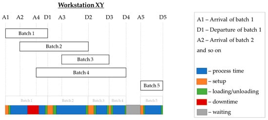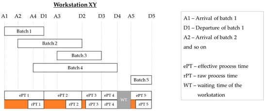 Jacobs, J. H. et al. present an approach to measure and quantify the temporal variability in semiconductor industry production systems using the effective process time [11]. They define effective process time as the time in which a batch claims the capacity of a production unit [11]. This means that the effective process time includes both the time at which a workstation is prepared to process a batch and the time at which the batch is effectively processed. The data required to calculate the effective process time are determined using an event-based approach. For this purpose, the authors acquire the arrival and departure events of the batches in the production unit (Figure 2) [12].