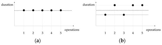 Every operation and thus every state the system can be in during the production time is recorded within a defined time period. This period can be a shift, a day, a week, and so on. Within the time period, the sum of states or, more precisely, the occurred operations per state are investigated for inherent temporal variability. For this purpose, a statistical parameter is modified. The parameter measures the deviations in the durations so that operations with the same or similar durations are investigated. Operations with the same duration follow a uniform planned value (Figure 4a), and operations with similar durations a determined target value (Figure 4b).