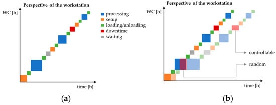 With regard to the occurring states, Figure 7b is not an ideal case in the sense of an ideal production process, since value-destroying components, such as waiting, are present. The idea of the ideal case shown herein is based on the assumption that the actual values correspond to the planned values with regard to the quantity and duration of the operations per state. In reality, there are deviations that affect the actual production time (actual time). Figure 7b contains inherent temporal variability, whereby the duration of the operations per state increases unplanned. The figure shows a random event in the form of an unplanned interruption during the first processing. Planned maintenance is also affected by fluctuations, but in contrast with unplanned downtime, this is a planned, controllable intervention that has been delayed unplanned. Since each operation per state can be affected by temporal variability at any time, each state must also be examined, as shown in the modified equation (Equation (14)). The variable t represents the affected lead time component or state that is examined: