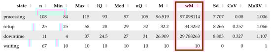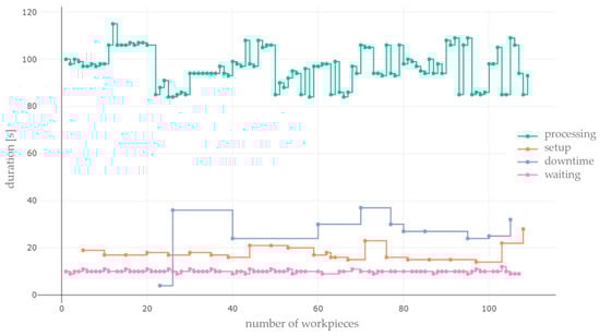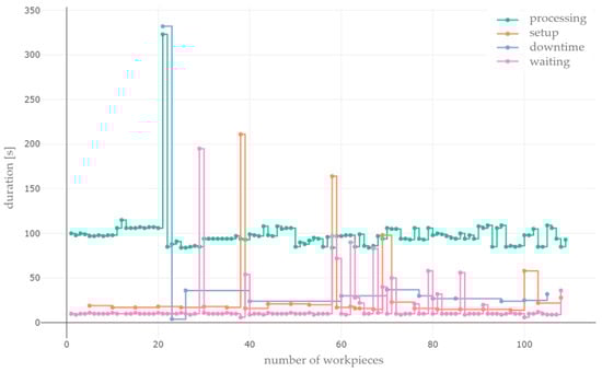 Another fact that needs to be mentioned for further testing concerns the bundling of operations with similar durations. Bundling causes controllable variability, but uncontrollable variability can be hidden. For example, the processing span ranged from 86 to 108 s. In this case, a processing operation of 86 s affected by uncontrollable variability would not be detected as long as the time delay was below 30 s. However, separate consideration of the product types would have resulted in detection.