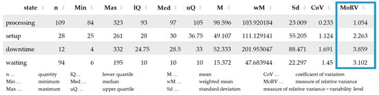 First, we investigate which state is affected by temporal variability (via the variability level and quantity of operations) and whether it is controllable or uncontrollable variability. Unlike the other states in Figure 13, the processing state from test series one consciously contains variability (controllable variability) due to the grouping of the different product types. For this reason, the processing state has a relatively low variability level close to the optimal value of ‘1’.