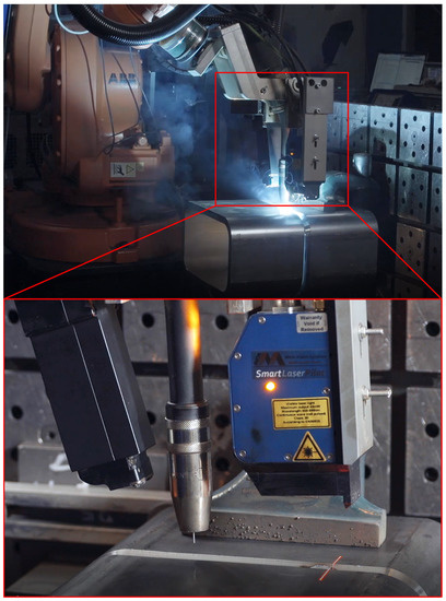 The physical experimental setup can be found in Figure 1. The torch configuration in Figure 1 also includes the HKS thermal profile sensor (black sensor behind the welding torch), which is capable of sensing the infrared radiation over the weld pool, thus enabling the measurement of the thermal distribution over the weld pool and analysis of the weld pool behavior. However, this sensor was not used for feedback control purposes, but separately to evaluate the thermal properties of the weld joint.
