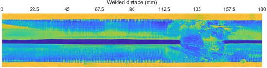 The physical connections enable the possibility to do close to real-time calculations, optimization and updating of the welding parameters during welding. The important data of the welding process were gathered on the PC, where it is processed and combined in the MATLAB R2017a software. The raw data from the Meta sensor (50 Hz) were first gathered and analyzed with the defined algorithm to recognize the important features of the seam; root gap and root face, as described in more detail in a previous research article [19]. An example of the groove profile can be found in Figure 2. The example groove profile can be seen in Figure 1. The figure colors change from deep blue, the most distant, to yellow, the closest point detected. The root gap can be measured by the width of the deep blue gap and the root height can be calculated by measuring the depth difference between the plate’s surface and the edge of the beveled groove near the root gap. In Figure 2, the tack weld can be seen between roughly 120 mm and 150 mm. The marking on the beveled surfaces originates from the manual grinding operation of the tack weld to achieve smooth connection and prevent any inclusion and quality imperfections in the connecting points of tack welds.
