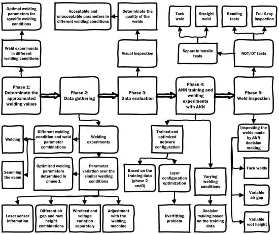 In phase 4, the NN configuration is optimized for the case study and the results of the NN decision-making are simulated over the desired parameter window of the use case. In phase 5, the IWS is tested with separate test specimens, where the welding conditions, root gap and root face are varied. The specimens are tested in more detail with NDT and DT testing to verify the achieved quality of the test specimen. The more detailed procedures of the main steps are discussed in the following paragraphs and sections.